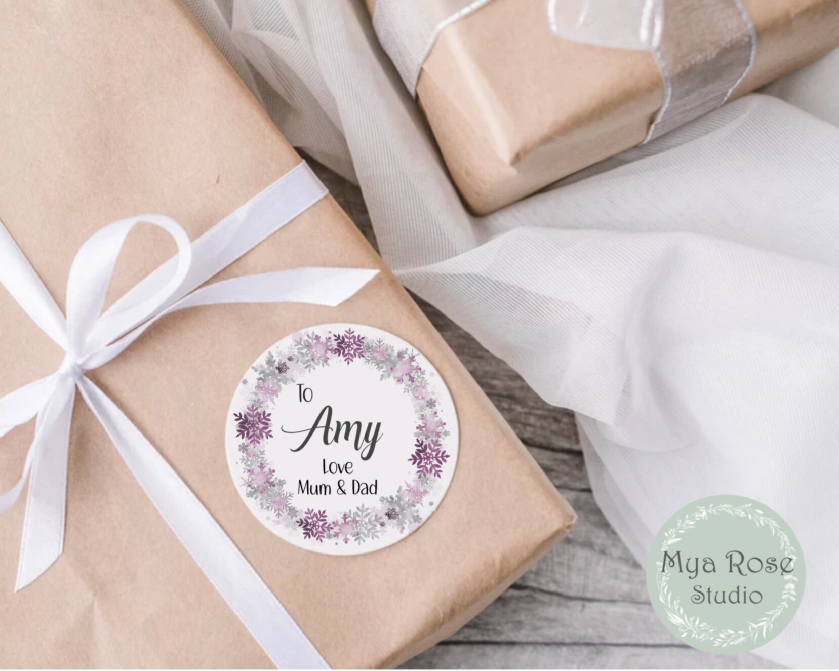 Personalised snowflake wreath Christmas stickers, available in 6 colours, Blue, Lilac, Purple, Pink, Green and Teal.